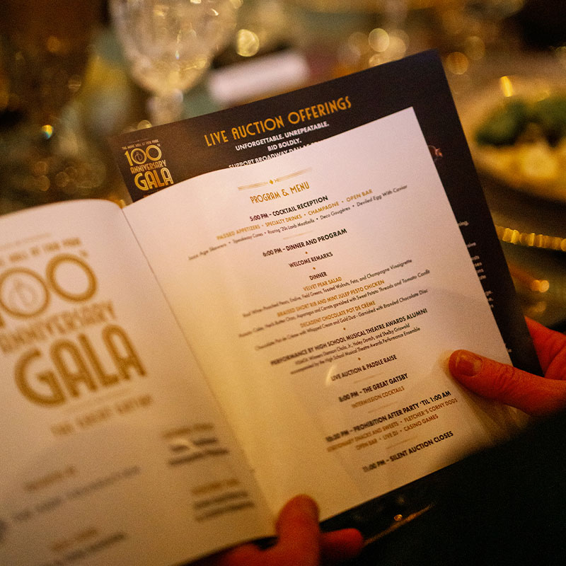 Reed Creative Group developed the visual identity and design system for the event, creating a cohesive experience across invitations, promotional materials, and on-site event pieces. The design balanced Broadway elegance with the celebratory spirit of the centennial milestone, ensuring the evening felt both theatrical and sophisticated.